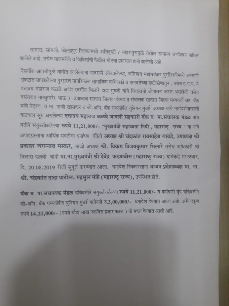 सातारा, सांगली व कोल्हापूर जिल्ह्यातील पूरग्रस्त नागरिकांसाठी रुपये 11,21,000/- मदत करण्यात आली.